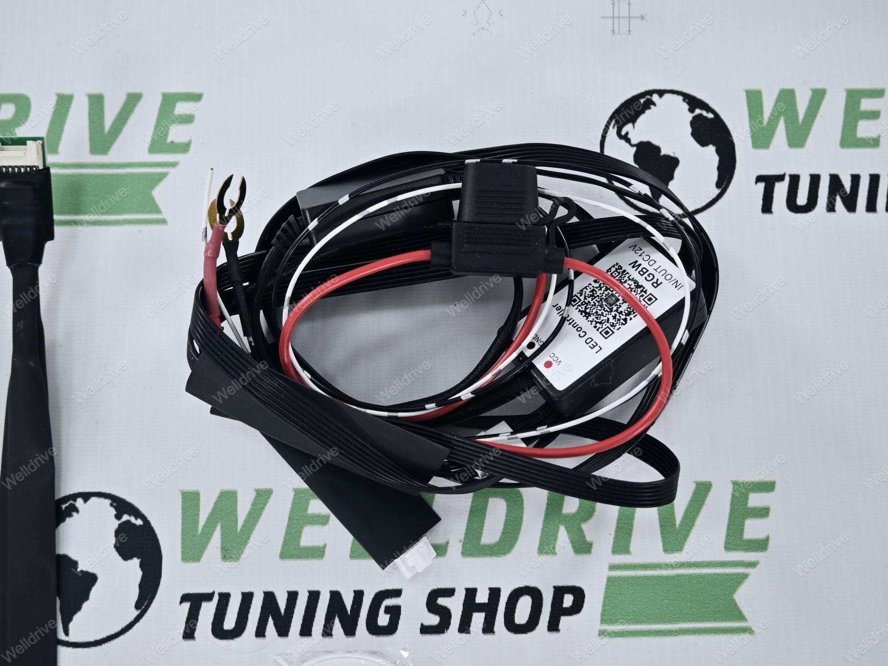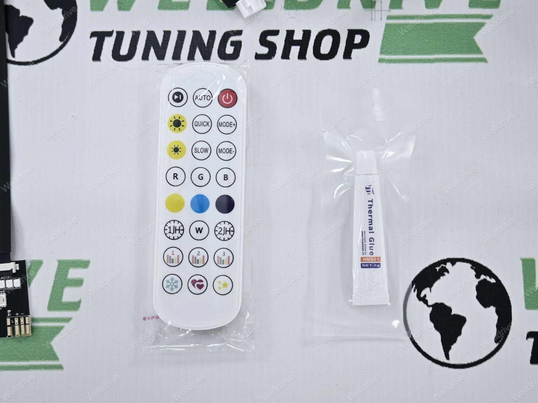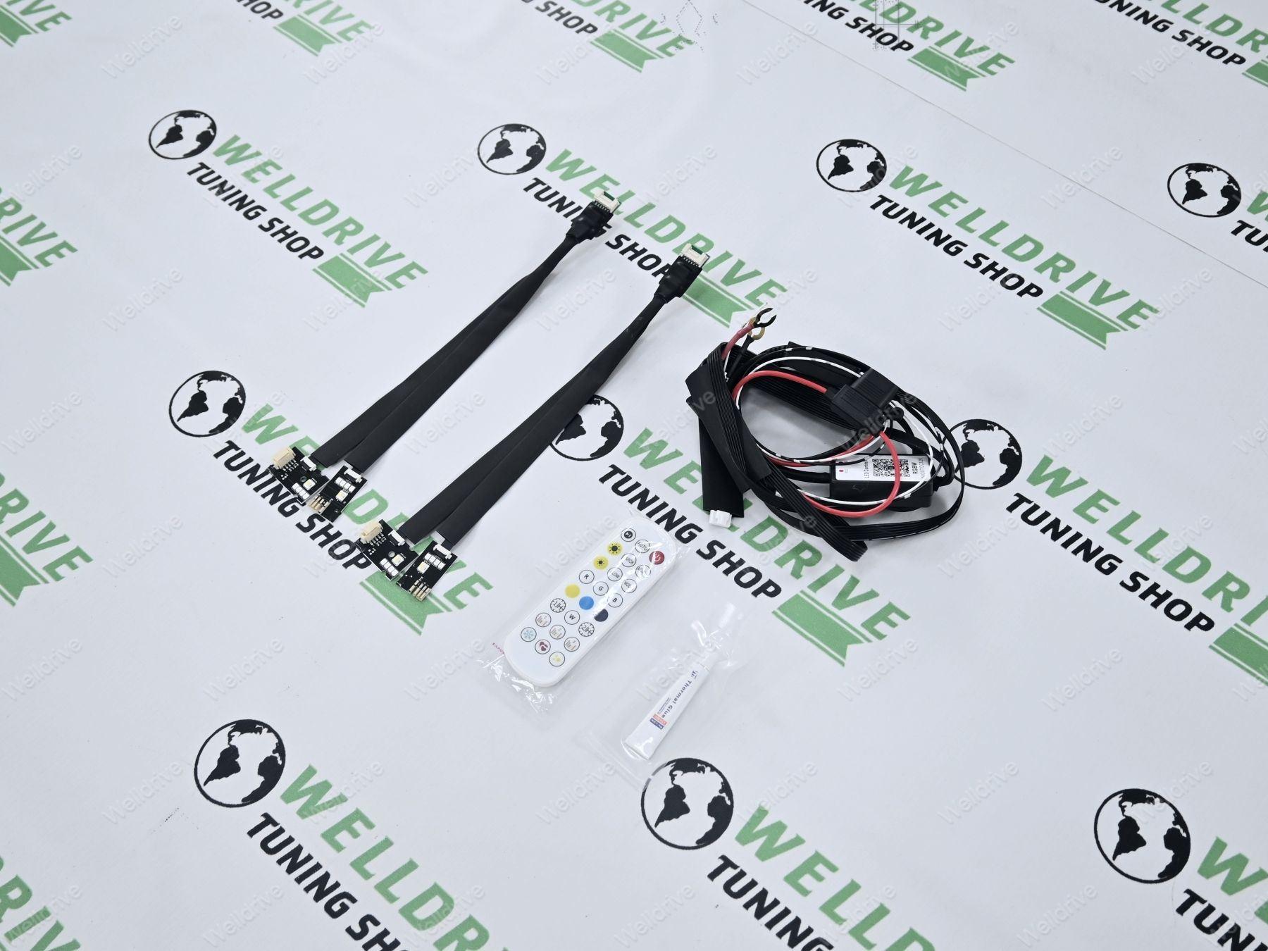 В комплекте: пульт дистанционного управления для изменения цвета, руководство по подключению телефона для управления RGB модулями через Bluetooth, цветной чип-модуль, модуль управления, комплект удлинителей, радиатор.