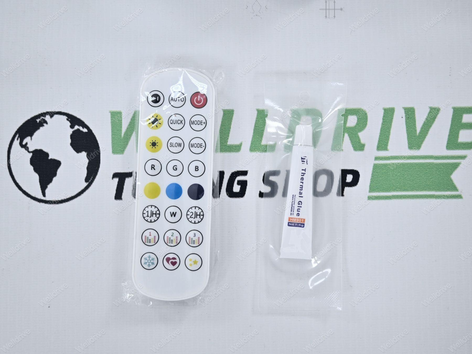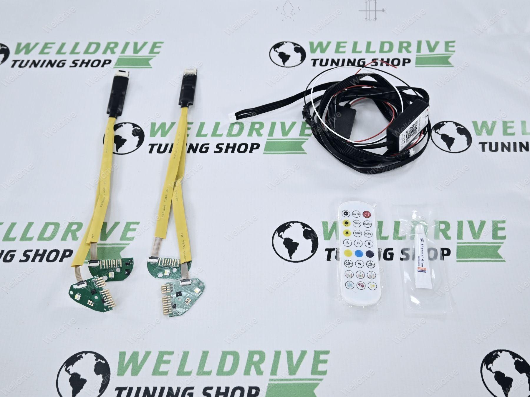 В комплекте: пульт дистанционного управления для изменения цвета, руководство по подключению телефона для управления RGB модулями через Bluetooth, цветной чип-модуль, модуль управления, комплект удлинителей, радиатор.
