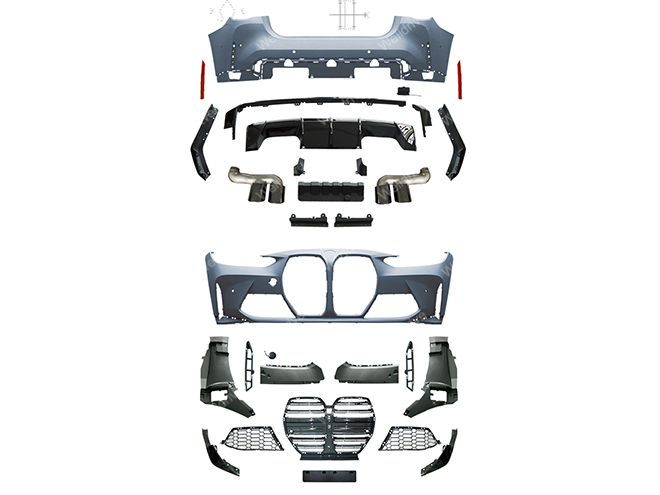 Комплект обычно состоит из четырех-пяти частей, с опциями для i4 электрических версий. Дизайн подчеркивает агрессию, особенно в глянцевом исполнении, подходя для стайлинг-ориентированных владельцев.
